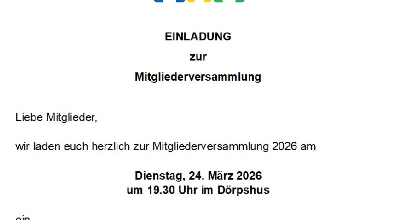 Der W.i.P. lädt seine Mitglieder herzlich zur Mitgliederversammlung am 24.03.2026 um 19.30 Uhr ins Dörpshus ein.